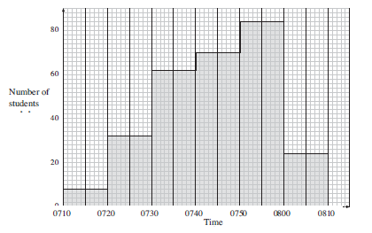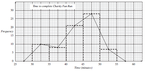 A graph like this is often called a histogram, and is characterised by having a continuous scale along the horizontal axis. Note that in this case the widths of the bars are all the same, but this is not always the case, as you will see in the next section. Care though must be taken about the end points. For example, the first class interval (in minutes) would normally be 30 ≤ time < 35, so that a time of 35 minutes would be in the second class interval.