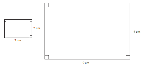 It is interesting to compare the area of the two rectangles. The area of the smaller rectangle is 6 cm2 and the area of the larger rectangle is 54 cm2 , which is nine times (32) greater.
