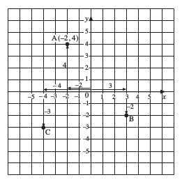 On a grid, plot the point A which has coordinates (–2, 4), the point B with coordinates (3, –2) and the point C with coordinates (–4, –3).