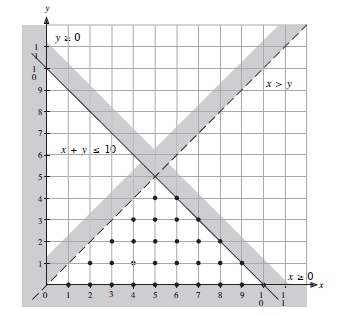 The triangle formed by the unshaded sides of each line is the region where all four inequalities are satisfied. The dots indicate all the possible employment options. Note that only integer values inside the region are possible solutions.