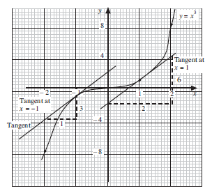 The graph of y = x3 is shown below. The tangents have been drawn at x = –1 and x = 1.