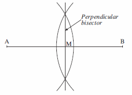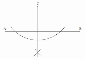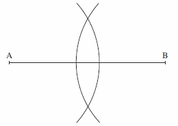 We begin by drawing arcs of equal radius, centred on the points A and B, as shown in the diagram.