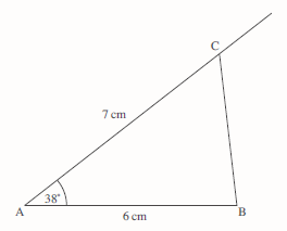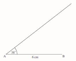 First draw a line of length 6 cm and measure an angle of 38°.