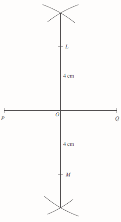 With compass centre P and centre Q and radius, say 7 cm, draw circle segments. The points of intersection form the perpendicular to PQ, crossing at point O. Use a ruler to find points L and M on this line.