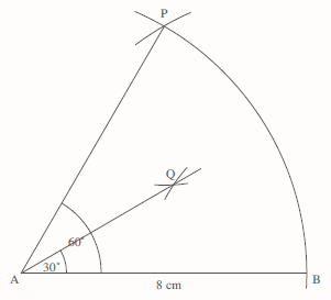 Using compasses, draw a sector of the circle, centre A, radius 8 cm, as shown below.
