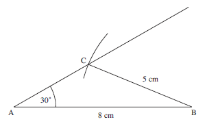 Then draw an arc centred at B, which crosses the line at 30° to AB.